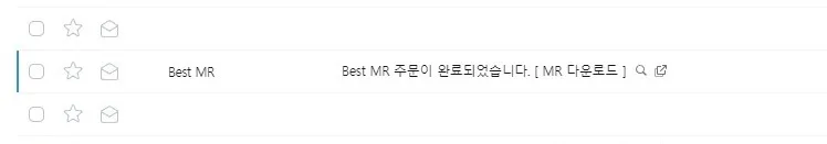 결제가 완료되면 서버에서 자동으로 결제 하실때 입력 하신 메일로 아래와 같이 ‘Best MR 주문이 완료되었습니다. [MR 다운로드]’ 라는 메일을 발송 합니다.